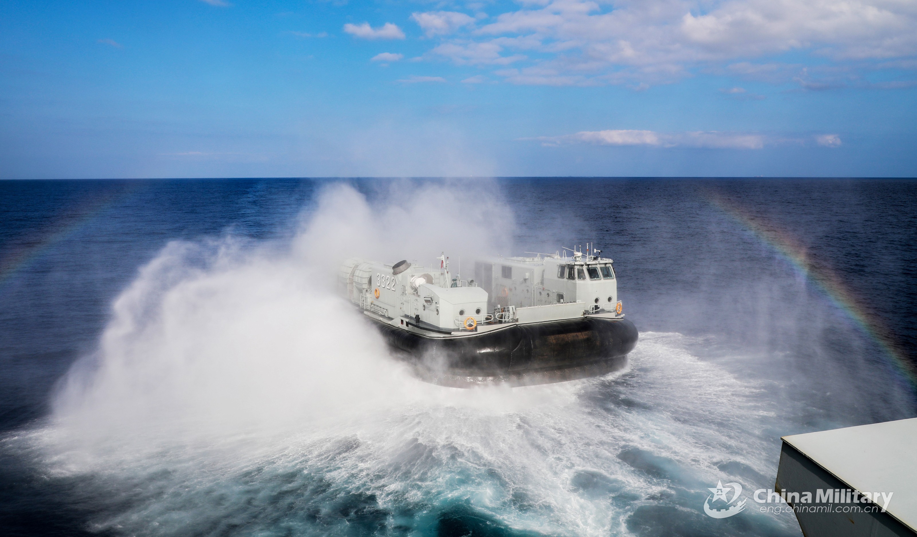 Air-cushion landing craft attached to a naval landing ship flotilla under the PLA Southern Theater Command steers off the dock of the dock landing ship Wuzhishan (Hull 987) during the actual combat training in late February, 2021. (eng.chinamil.com.cn/Photo by Qiao Chenxi)