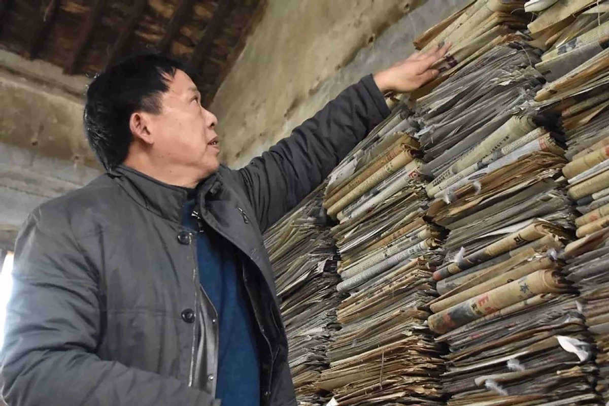 Du Dejian organizes newspapers in his home-based library in Zhangfang village of Yongji, Shanxi province. [Photo provided to chinadaily.com.cn]