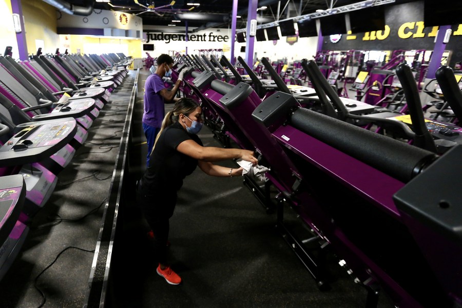 Staff members of Planet Fitness prepare for reopening to the public in Inglewood, Los Angeles County, California, the United States, March 15, 2021. (Xinhua)