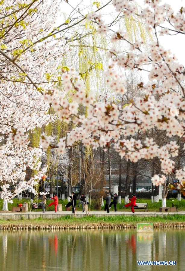Residents exercise at Cangwu green park in Haizhou District of Lianyungang, east China's Jiangsu Province, March 21, 2021. (Photo by Geng Yuhe/Xinhua)