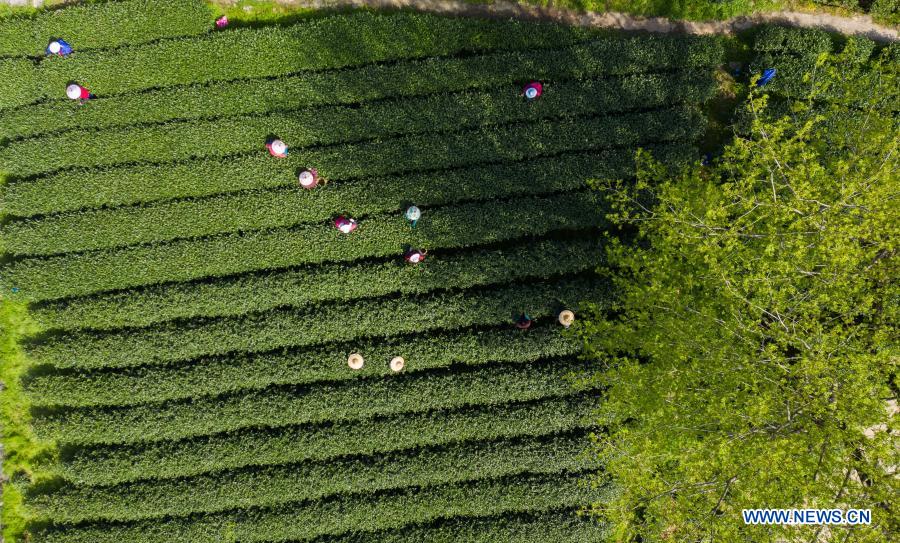Aerial photo shows a tea garden at Meijiawu Village of Hangzhou City, east China's Zhejiang Province, March 23, 2021. Longjing tea, also known as West Lake Dragon Well tea, is characterized by its green color, delicate aroma, mellow taste and beautiful shape. Farmers in Hangzhou now are busy harvesting Longjing tea leaves ahead of the Qingming Festival to produce the Mingqian (meaning "pre-Qingming") tea, which is made of the very first tea sprouts in spring and considered to be of high quality. (Xinhua/Xu Yu)