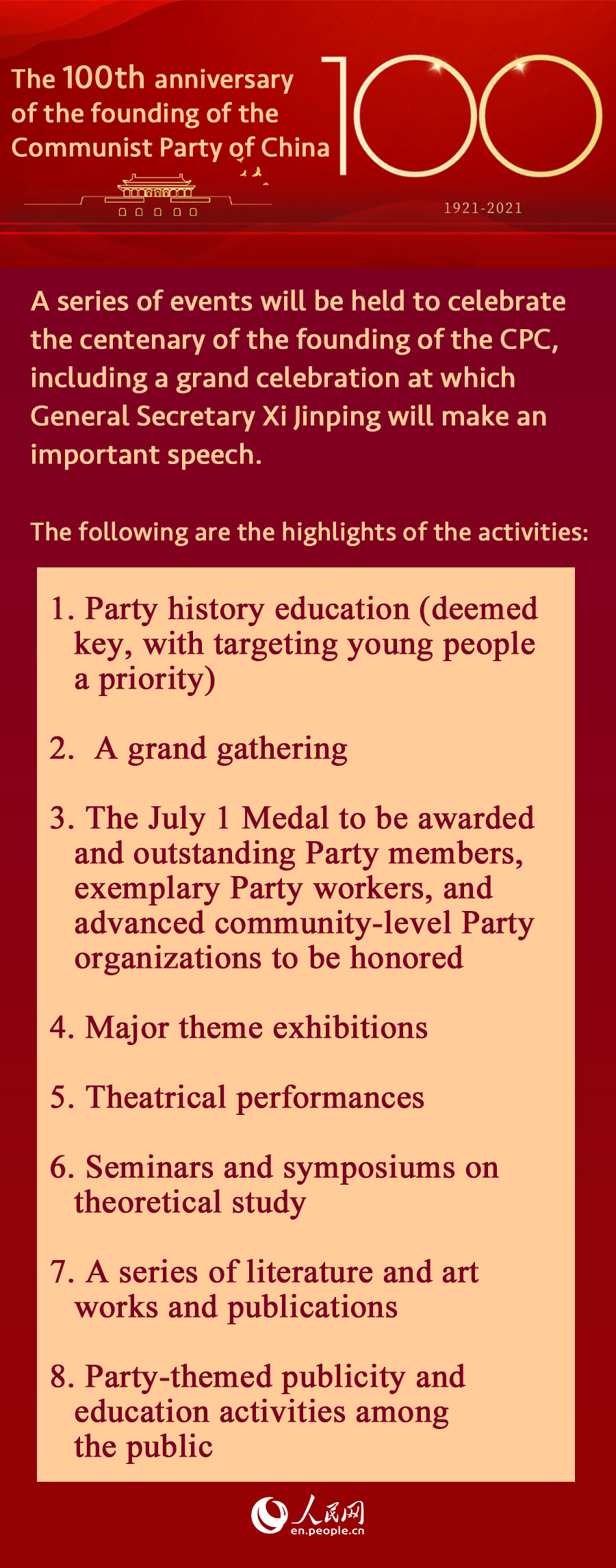 A series of events will be held to celebrate the centenary of the founding of the Communist Party of China (CPC), including a grand celebration at which General Secretary Xi Jinping will make an important speech, said Wang Xiaohui, deputy head of the Publicity Department of the CPC Central Committee, at a news conference in Beijing on Tuesday.