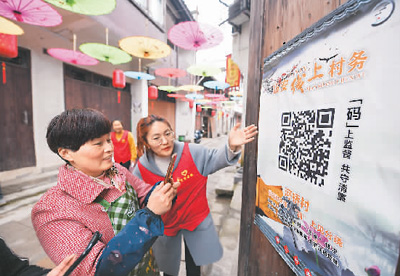A volunteer guides villagers to scan a QR code with their smartphones and use a mini program on the social platform WeChat to follow and supervise village affairs at Heqiao town, Lin'an district, Hangzhou city, east China's Zhejiang province. (Photo/Xinhua)