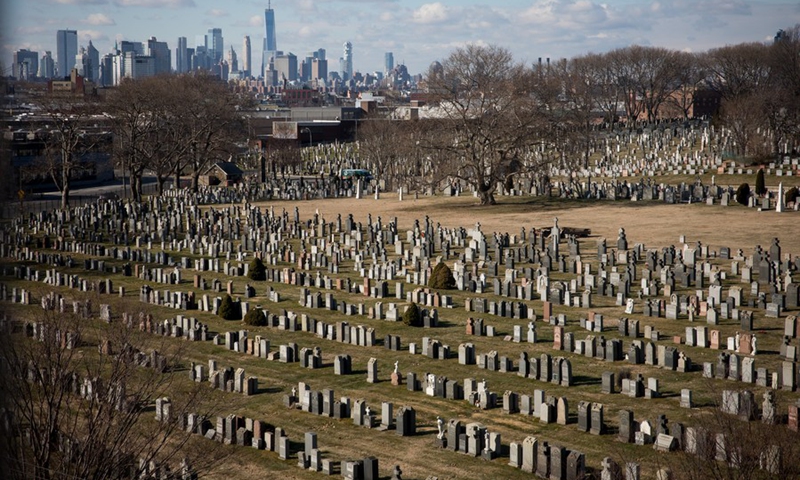 The Manhattan skyline is seen behind Calvary Cemetery in New York, the United States, on Jan. 18, 2021. (Photo: Xinhua)