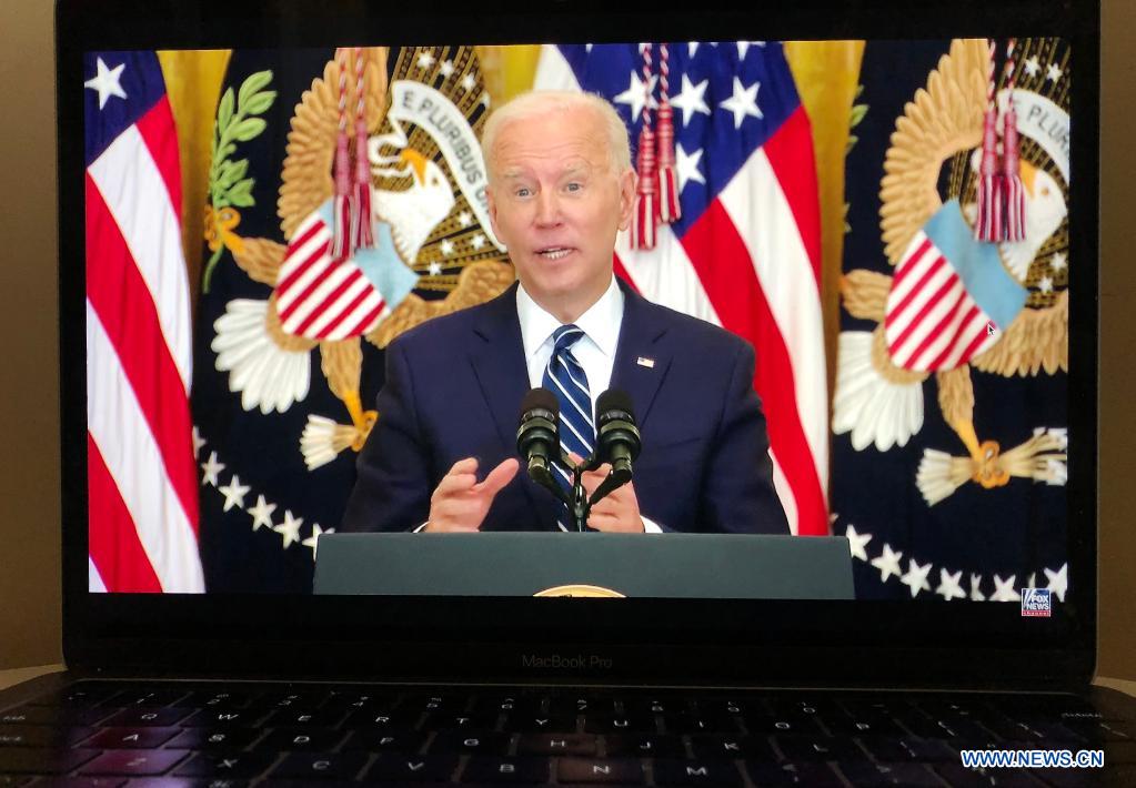 Photo taken in Arlington, Virginia, the United States, on March 25, 2021 shows a screen displaying U.S. President Joe Biden speaking during a press conference in Washington, D.C., in a live stream provided by Fox News. Biden held on Thursday his first formal press conference since taking office. (Xinhua/Liu Jie)
