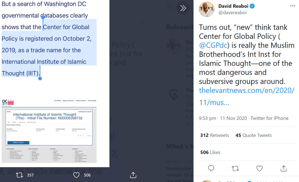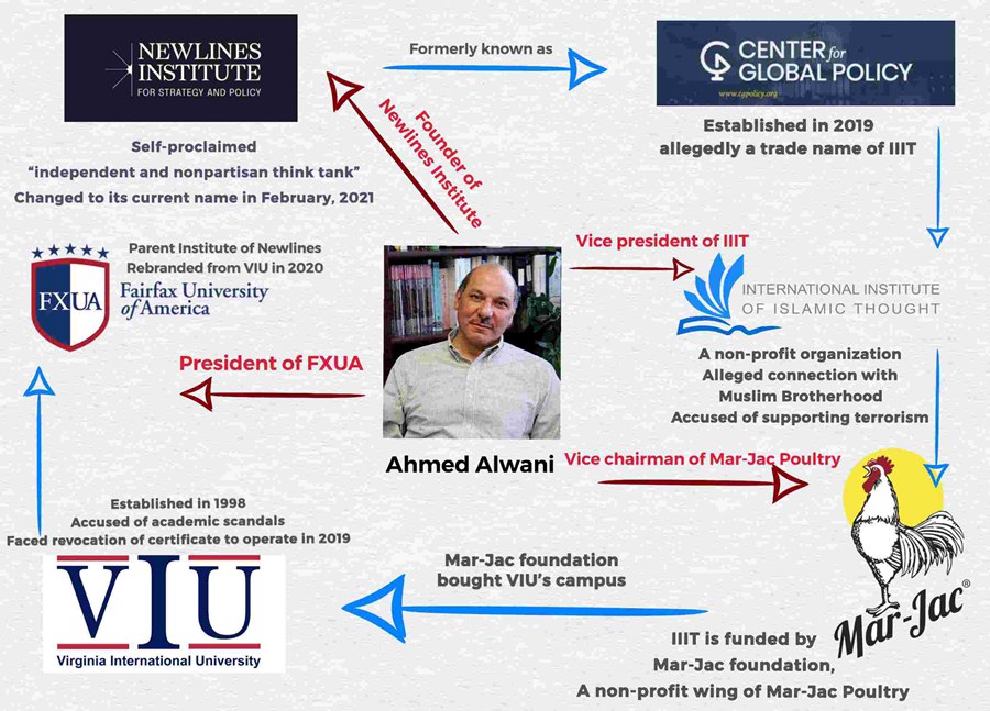 The hidden connection between the organization and IIIT has always been a contested issue. In November 2020, David Reaboi, a Claremont Institute Lincoln Fellow, blasted the then Center for Global Policy (CGP) as a trade name for the IIIT, citing records from the Washington DC governmental database to support his claim. The accusation was rejected by Faysal Itani, CGP deputy director, who explained that the evidence provided by Reaboi referred to another Center for Global Policy that had been dissolved but maintained the trademark. Despite its denial of having any connection with IIIT, the Center for Global Policy changed its name into Newlines Institute for Strategy and Policy on Feb.20, 2021 on Twitter, a suspicious move for a “think tank” that has only existed for a year.
