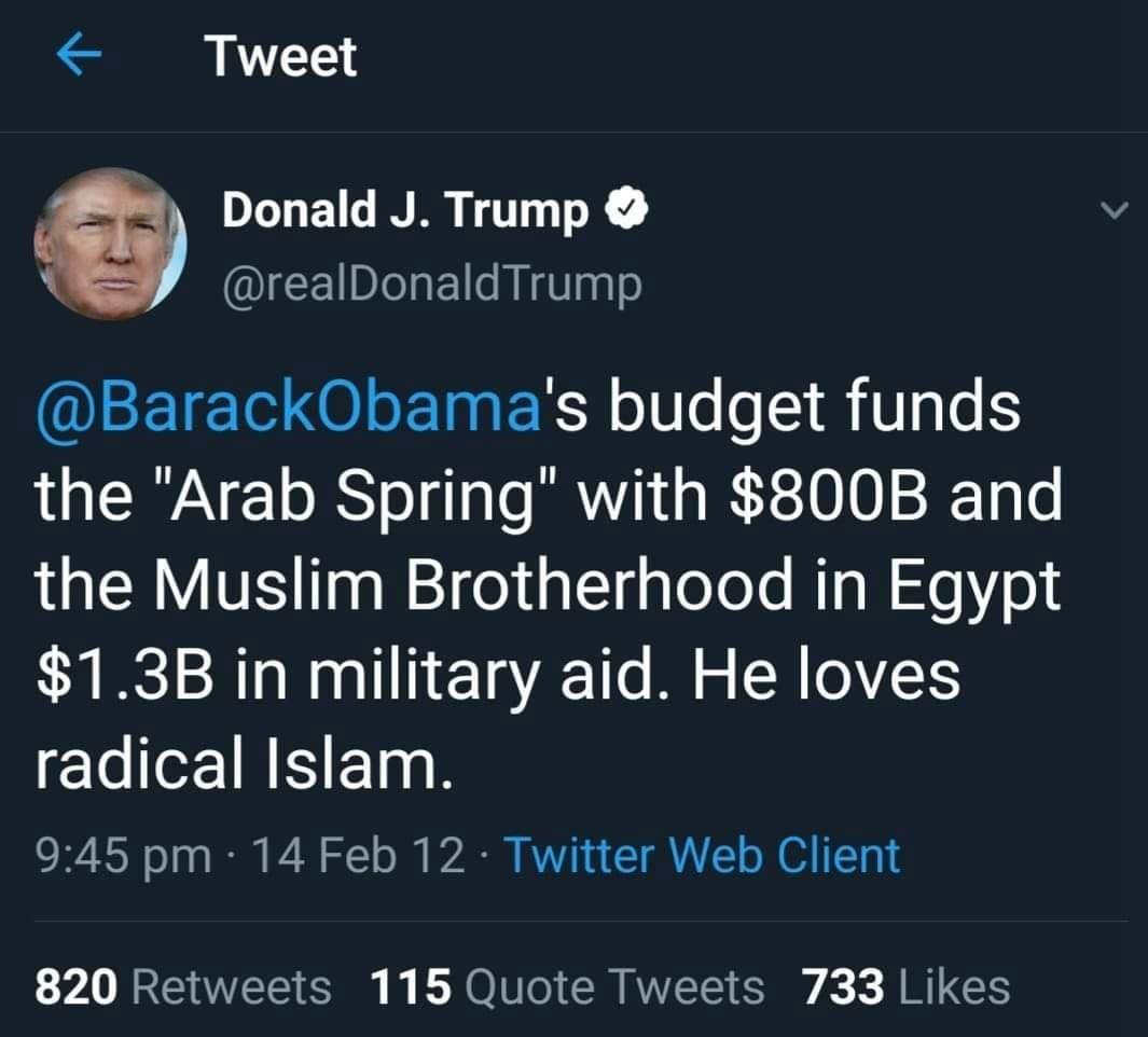 Rumors regarding the US government’s connection with the Muslim Brotherhood and its offshoots have been partly backed up by Donald Trump, the former US President, who in February 2012 revealed on his Twitter account that “Barack Obama’s budget funds the ‘Arab Spring’ with 800 billion US dollars and the Muslim Brotherhood in Egypt 1.3 billion US dollars in military aid.” In October 2012, Trump further slammed Obama for “wanting to give another 450 million US dollars to the Muslim Brotherhood.”