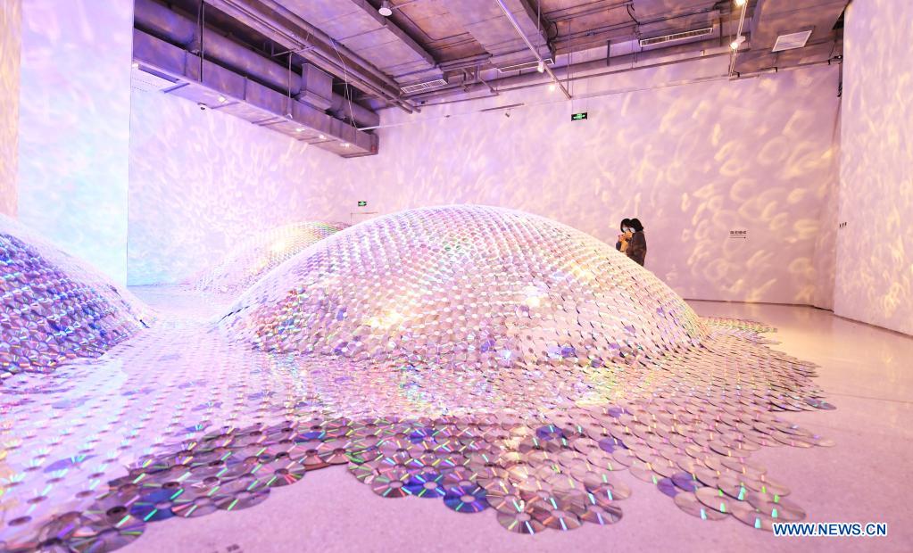 Visitors view an artwork during the contemporary art show "WAVELENGTH: AT THE MOMENT" at Beijing Times Art Museum in Beijing, capital of China, March 27, 2021. The contemporary art show "WAVELENGTH: AT THE MOMENT" kicked off on Saturday and will last until June 14, 2021, featuring artworks from 18 artists from China and abroad. (Xinhua/Ren Chao)