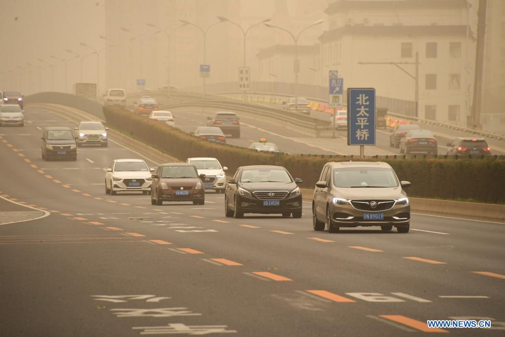 Cars drive on a road during sand storm in Beijing, capital of China, March 28, 2021. (Xinhua/Ren Chao)