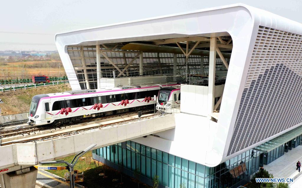 A train sets out from Hongshan Station on Subway Line 1 in Luoyang, central China's Henan Province, March 28, 2021. Luoyang Subway Line 1, with a length of about 25km and 19 stations, was put into operation on Sunday. (Photo by Zhang Yixi/Xinhua)