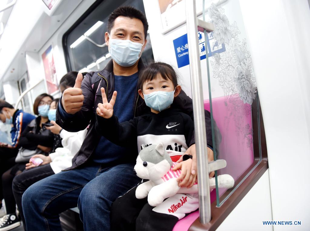 Passengers pose for a photo in a train on Subway Line 1 in Luoyang, central China's Henan Province, March 28, 2021. Luoyang Subway Line 1, with a length of about 25km and 19 stations, was put into operation on Sunday. (Photo by Zhang Yixi/Xinhua)