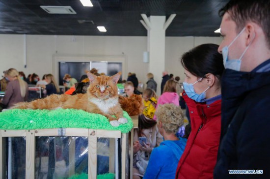 People wearing face masks look at a cat during a cat show organized by a cat-fancier club at Sokolniki Park in Moscow, Russia, March 28, 2021. More than 400 cats and kittens of over 30 breeds are presented during the fair. (Photo by Alexander Zemlianichenko Jr/Xinhua)