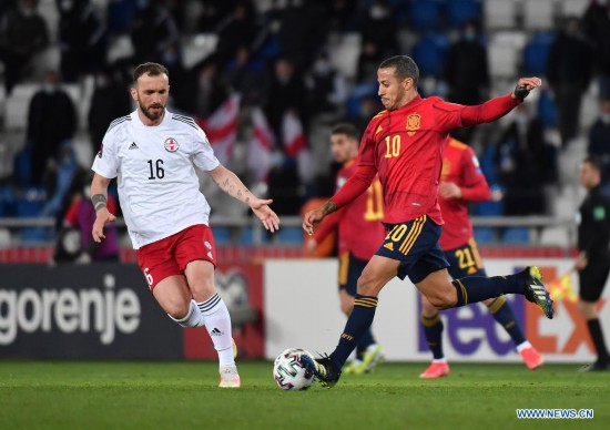 Nika Kvekveskiri (L) of Georgia vies with Thiago Alcantara of Spain during the 2022 FIFA World Cup qualification match between Georgia and Spain in Tbilisi, Georgia, March 28, 2021. (Photo by Tamuna Kulumbegashvili/Xinhua)