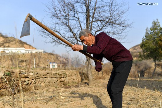 Zhang Shangbao works in his field in Tietou Village of Shilou County, north China's Shanxi Province, March 24, 2021. Zhang, 61, who has only one hand, has been walking through the mountains day after day since 1976, safeguarding the health of the locals. There are more than 600 villagers living in 5 hamlets of Tietou Village tucked away in the Lyuliang Mountains. In the past, it was difficult to access healthcare, which had plagued the masses here for a long time. In 1976, Zhang Shangbao graduated from a health school at the age of 16 and returned to his hometown to work as a village doctor. From then on, Zhang started his life staying on call around the clock to see patients. Unfortunately, Zhang lost his right hand in an accident when he was 35. With the tenacity of not bowing to fate, he quickly mastered the skills of living on his own. Through repeated practice, Zhang also learned how to inject fluids, vaccinate and fill in health records with his left hand. Last April, Zhang Shangbao reached retirement age, but he chose to continue with his work. "As long as the villagers need me," He said, "I will stick to my post." (Xinhua/Zhan Yan)