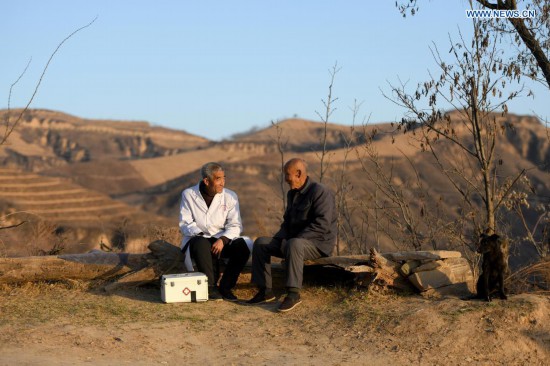 Zhang Shangbao (L) talks with a villager in Tietou Village of Shilou County, north China's Shanxi Province, March 23, 2021. Zhang, 61, who has only one hand, has been walking through the mountains day after day since 1976, safeguarding the health of the locals. There are more than 600 villagers living in 5 hamlets of Tietou Village tucked away in the Lyuliang Mountains. In the past, it was difficult to access healthcare, which had plagued the masses here for a long time. In 1976, Zhang Shangbao graduated from a health school at the age of 16 and returned to his hometown to work as a village doctor. From then on, Zhang started his life staying on call around the clock to see patients. Unfortunately, Zhang lost his right hand in an accident when he was 35. With the tenacity of not bowing to fate, he quickly mastered the skills of living on his own. Through repeated practice, Zhang also learned how to inject fluids, vaccinate and fill in health records with his left hand. Last April, Zhang Shangbao reached retirement age, but he chose to continue with his work. "As long as the villagers need me," He said, "I will stick to my post." (Photo by Liu Liangliang/Xinhua)