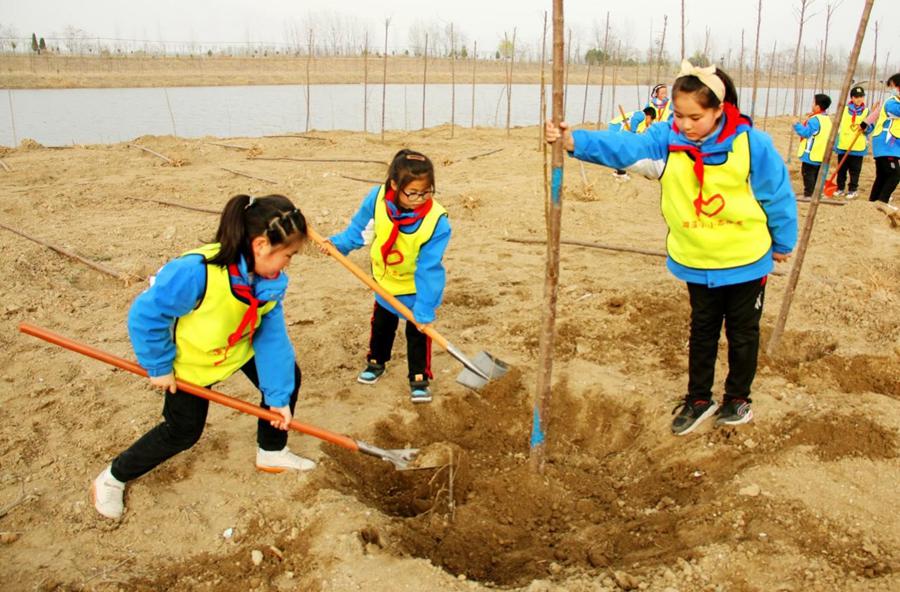 On March 10, more than 20 students from the No. 1 Experimental School of Suixi County, Huaibei City, Anhui Province participated in voluntary tree planting activities at the green spot of Hongnan Village, Sipu Town. (People’s Daily Online/Zhou Fangling)