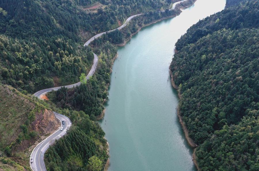 On February 24, the vehicle drove on a rural road between green trees in Gangbian Township, Congjiang County, Guizhou Province. (People’s Daily Online/Luo Jinglai)