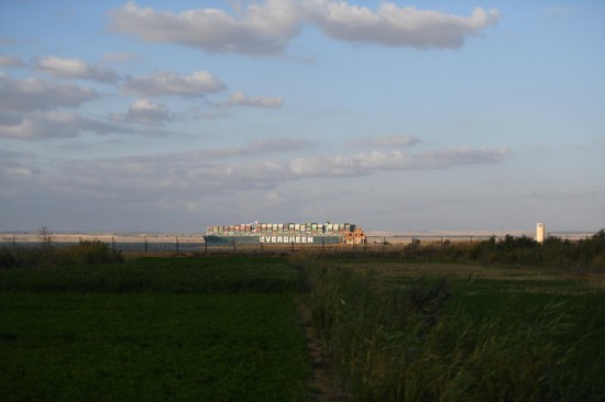 Photo taken on March 29, 2021 shows the container ship Ever Given moving on the Suez Canal, Egypt. The traffic in Suez Canal resumed after massive container ship Ever Given has been successfully refloated as being stranded in the canal for almost a week, Egypt's Suez Canal Authority (SCA) said on Monday. (Xinhua/Wu Huiwo)