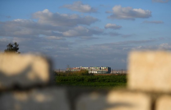 Photo taken on March 29, 2021 shows the container ship Ever Given moving on the Suez Canal, Egypt. The traffic in Suez Canal resumed after massive container ship Ever Given has been successfully refloated as being stranded in the canal for almost a week, Egypt's Suez Canal Authority (SCA) said on Monday. (Xinhua/Wu Huiwo)