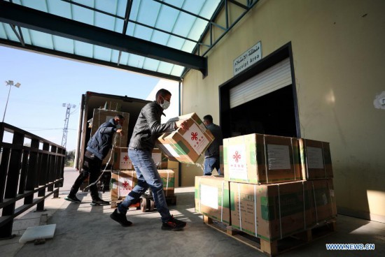 Workers carry Sinopharm COVID-19 vaccines in Salem village, east of the West Bank city of Nablus, March 29, 2021. China on Monday handed over a batch of donated Sinopharm COVID-19 vaccines to Palestine to support its nationwide fight against the pandemic. (Photo by Ayman Nobani/Xinhua)
