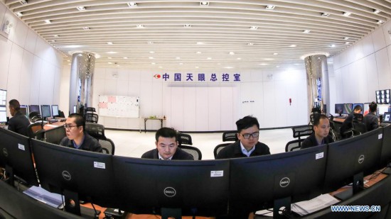 Staff members work at the control room of China's Five-hundred-meter Aperture Spherical radio Telescope (FAST) in southwest China's Guizhou Province, March 27, 2021. FAST has identified over 300 pulsars so far. Located in a naturally deep and round karst depression in southwest China's Guizhou Province, it officially began operating on Jan. 11, 2020. (Xinhua/Ou Dongqu)