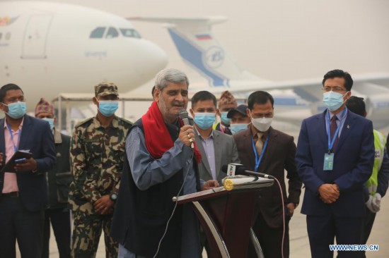 Nepali Health Minister Hridayas Tripathi speaks at a welcome ceremony for China-donated COVID-19 vaccines at Tribhuvan International Airport in Kathmandu, Nepal, on March 29, 2021. A chartered flight of the Nepal Airlines, the national flag carrier, brought back the vaccines donated by China on Monday, giving a major boost for Nepal to continue its vaccination campaign against the pandemic. (Xinhua/Zhou Shengping)