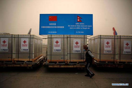 China-donated COVID-19 vaccines arrive at Tribhuvan International Airport in Kathmandu, Nepal, on March 29, 2021. A chartered flight of the Nepal Airlines, the national flag carrier, brought back the vaccines donated by China on Monday, giving a major boost for Nepal to continue its vaccination campaign against the pandemic. (Photo by Sulav Shrestha/Xinhua)