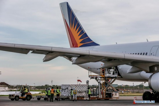 Staff members transport cargo containing the first batch of government-purchased Sinovac COVID-19 vaccines upon their arrival in Manila, the Philippines, March 29, 2021. The Philippines on Monday received the first batch of the Sinovac COVID-19 vaccines its government has purchased from China. (Xinhua/Rouelle Umali)