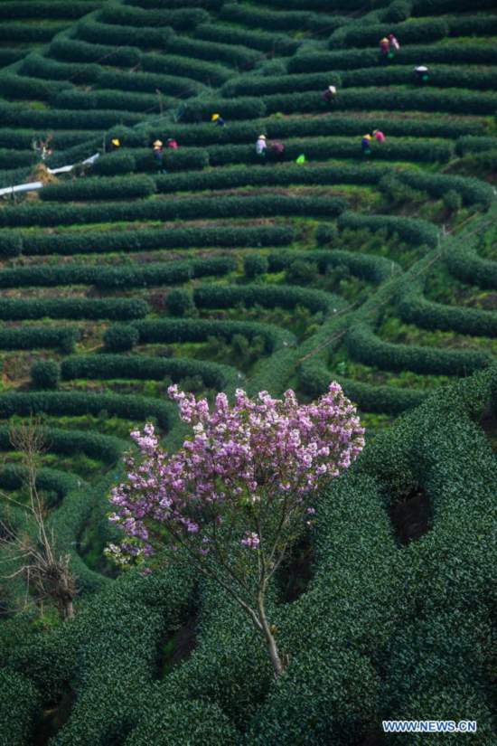 Cherry blossoms seen in tea garden in Hangzhou