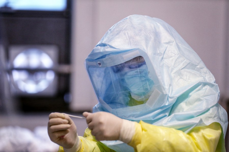 A doctor collects samples from a patient at the Zhongfaxincheng campus of Tongji Hospital affiliated to Huazhong University of Science and Technology in Wuhan, central China's Hubei Province, Feb. 14, 2020. (Photo by Cui Meng/Xinhua)
