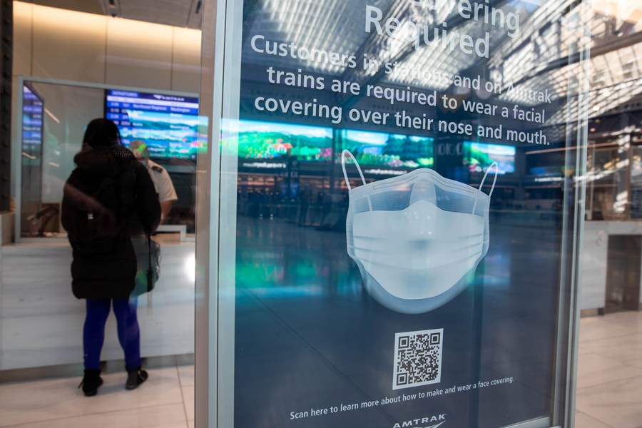 A sign advertising a face mask requirement is displayed at the Moynihan Train Hall in New York, the United States, Jan. 23, 2021. (Photo by Michael Nagle/Xinhua)