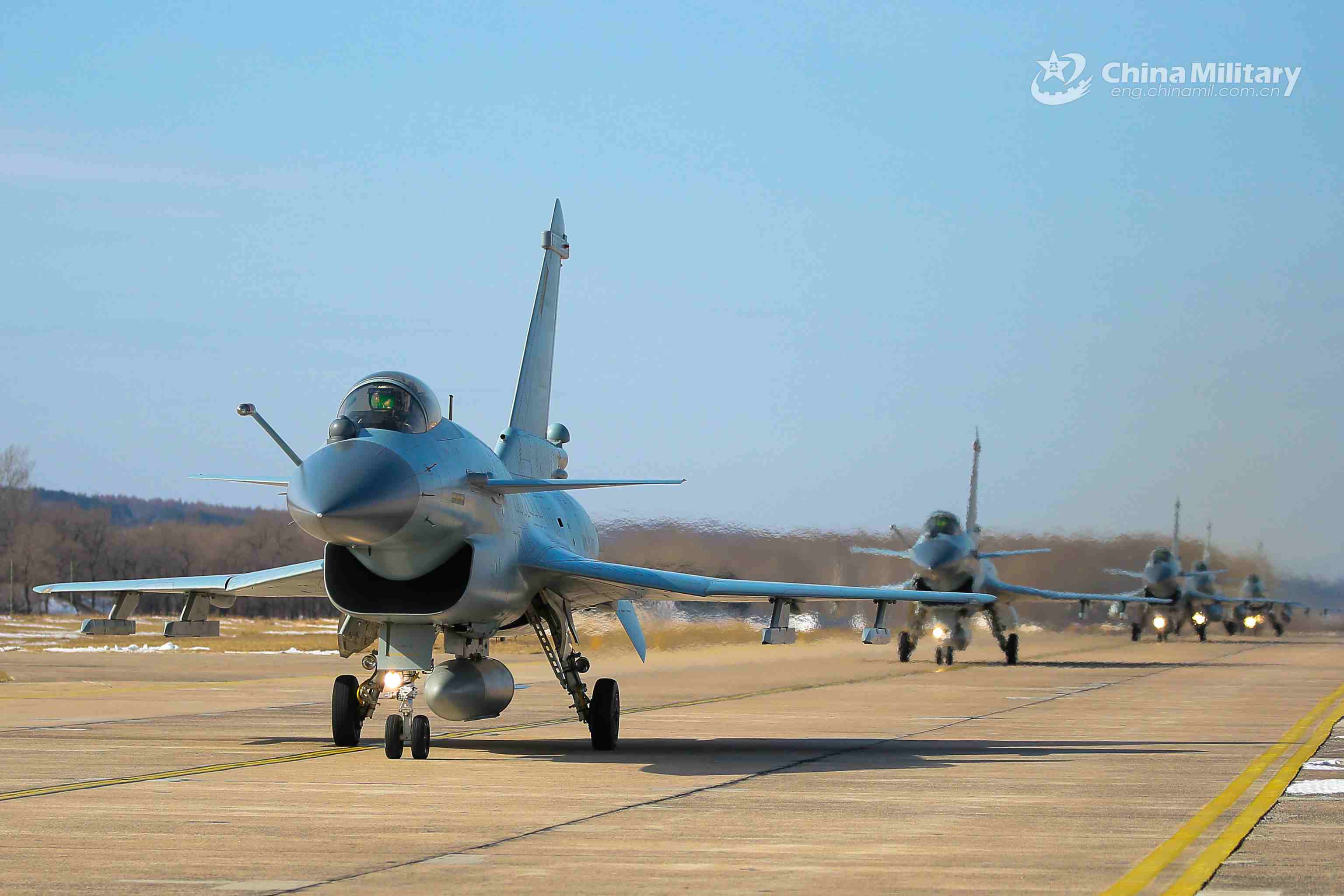 Four pilots and two instructors assigned to an aviation brigade of the air force under the PLA Northern Theater Command taxi their fighter jets on the flightline in formation during a flight exam on February 26, 2021. The four pilots have just completed the training on flight combat skills, which focused on aerial confrontation and flexible tactical options, aiming to enhance the flying skills and tactical cooperation among the pilots. (eng.chinamil.com.cn/Photo by Luo Rong)