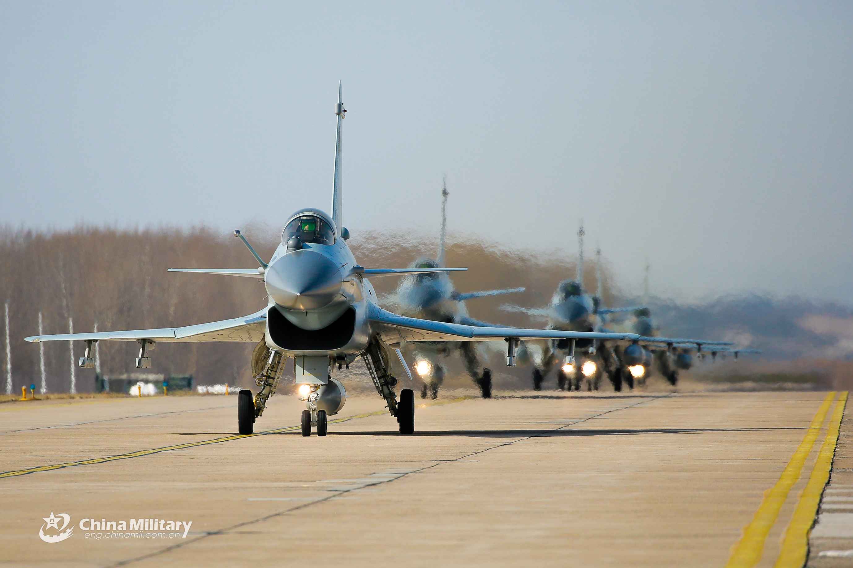 Four pilots and two instructors assigned to an aviation brigade of the air force under the PLA Northern Theater Command fly their fighter jets in delta formation during a flight exam on February 26, 2021. The four pilots have just completed the training on flight combat skills, which focused on aerial confrontation and flexible tactical options, aiming to enhance the flying skills and tactical cooperation among the pilots. (eng.chinamil.com.cn/Photo by Luo Rong)