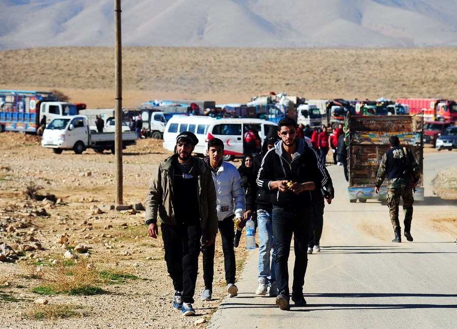Syrian refugees arrive at the al-Zamarani border crossing between Syria and Lebanon, north of Damascus, Syria, on Dec. 3, 2019. (Str/Xinhua)
