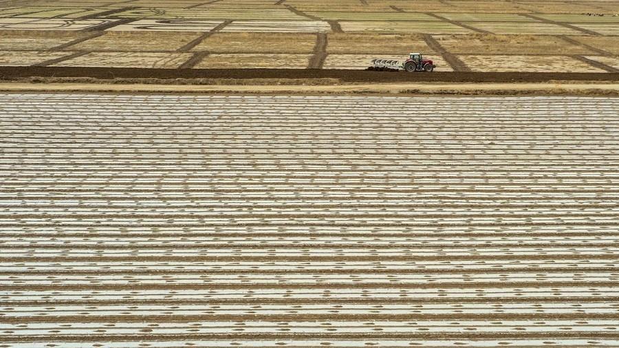 A farmer ploughs in a field with a tractor in Bachu County, northwest China's Xinjiang Uygur Autonomous Region, March 28, 2021. (Xinhua/Ma Kai)