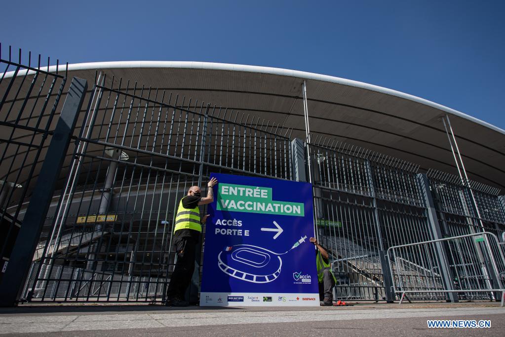 Staff members set up a sign of a new COVID-19 vaccination center in Saint-Denis, France, on March 31, 2021. Starting from mid-April people over 60 in France will be able to get vaccinated, from May 15 the vaccination will be open to people aged between 50 and 60 and from mid-June the age limit will be lifted, said French President Emmanuel Macron on Wednesday. (Photo by Aurelien Morissard/Xinhua)