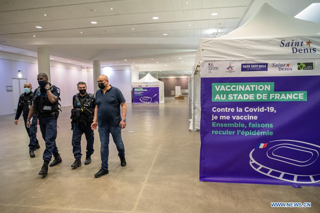 Policemen walk past a tent at a new COVID-19 vaccination center in Saint-Denis, France, on March 31, 2021. Starting from mid-April people over 60 in France will be able to get vaccinated, from May 15 the vaccination will be open to people aged between 50 and 60 and from mid-June the age limit will be lifted, said French President Emmanuel Macron on Wednesday. (Photo by Aurelien Morissard/Xinhua)