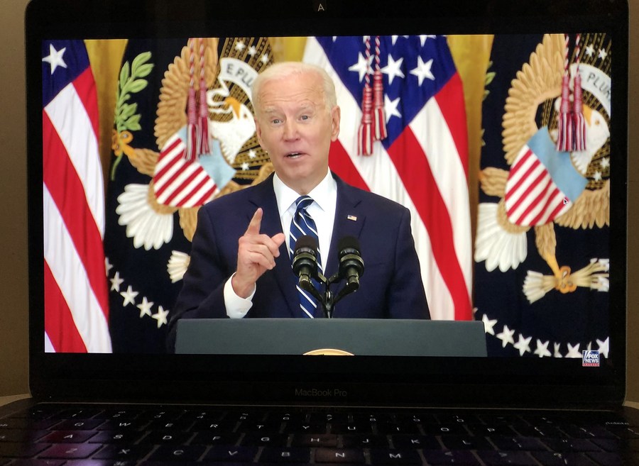 Photo taken in Arlington, Virginia, the United States, on March 25, 2021 shows a screen displaying U.S. President Joe Biden speaking during a press conference in Washington, D.C., in a live stream provided by Fox News. (Xinhua/Liu Jie)