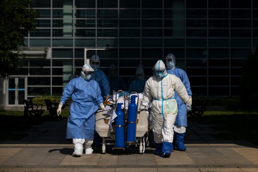 Medical workers transfer a COVID-19 patient in severe and critical condition to the Intensive Care Unit (ICU) ward at the Zhongfaxincheng campus of Tongji Hospital affiliated to Huazhong University of Science and Technology in Wuhan, central China's Hubei Province, April 12, 2020. (Xinhua/Shen Bohan)