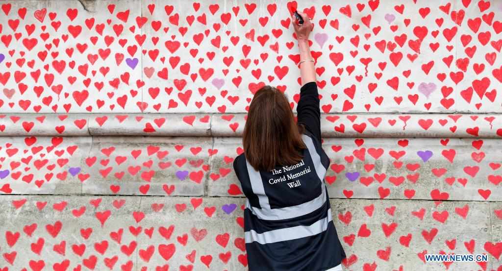 A volunteer paints red hearts representing the victims who died of COVID-19 on the National COVID Memorial Wall outside St Thomas' Hospital in London, Britain, on March 31, 2021. Bereaved family members and volunteers are in the process of painting hearts along a half-mile wall opposite to the Houses of Parliament in London in remembrance of those who died of COVID-19. Another 4,052 people in Britain tested positive for COVID-19, bringing the total number of coronavirus cases in the country to 4,345,788, according to official figures released Wednesday. (Xinhua/Han Yan)