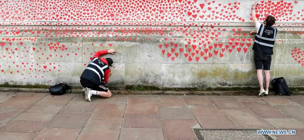 Volunteers paint red hearts representing the victims who died of COVID-19 on the National COVID Memorial Wall outside St Thomas' Hospital in London, Britain, on March 31, 2021. Bereaved family members and volunteers are in the process of painting hearts along a half-mile wall opposite to the Houses of Parliament in London in remembrance of those who died of COVID-19. Another 4,052 people in Britain tested positive for COVID-19, bringing the total number of coronavirus cases in the country to 4,345,788, according to official figures released Wednesday. (Xinhua/Han Yan)