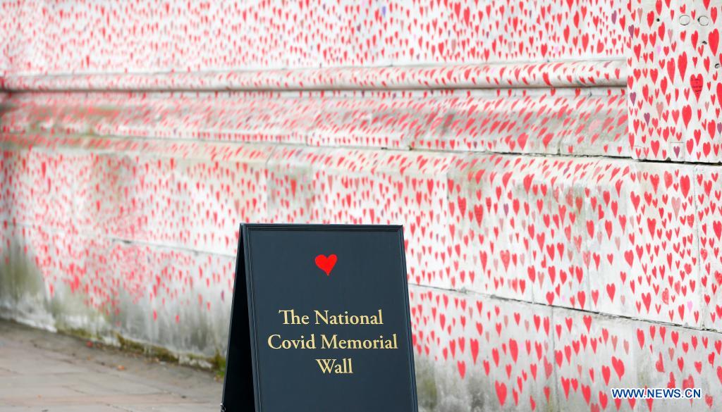 Photo taken on March 31, 2021 shows the National COVID Memorial Wall in London, Britain. Bereaved family members and volunteers are in the process of painting hearts along a half-mile wall opposite to the Houses of Parliament in London in remembrance of those who died of COVID-19. Another 4,052 people in Britain tested positive for COVID-19, bringing the total number of coronavirus cases in the country to 4,345,788, according to official figures released Wednesday. (Xinhua/Han Yan)