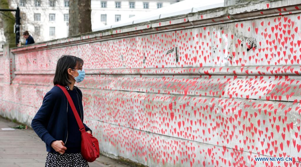 A woman looks at the National COVID Memorial Wall in London, Britain, on March 31, 2021. Bereaved family members and volunteers are in the process of painting hearts along a half-mile wall opposite to the Houses of Parliament in London in remembrance of those who died of COVID-19. Another 4,052 people in Britain tested positive for COVID-19, bringing the total number of coronavirus cases in the country to 4,345,788, according to official figures released Wednesday. (Xinhua/Han Yan)
