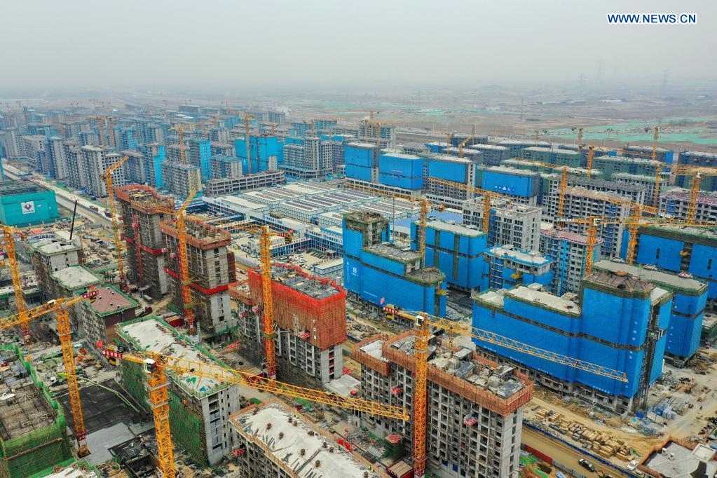 Aerial photo taken on March 18, 2021 shows the construction site of residential buildings in Rongdong area of Xiongan New Area, north China's Hebei Province. The Xiongan new area has begun its large-scale development and construction, with more than 100,000 constructors working on over 120 major projects in the area. The "city of the future" is greeting a brand new look day by day. (Xinhua/Mu Yu)
