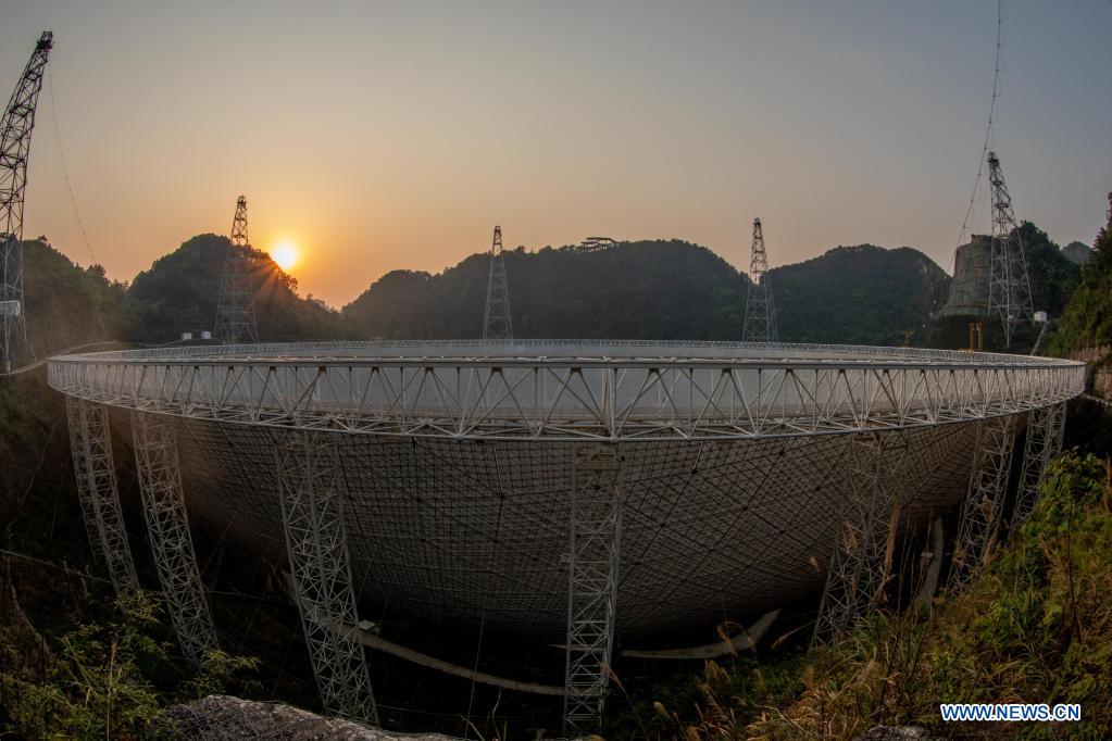 Photo taken on March 29, 2021 shows China's Five-hundred-meter Aperture Spherical Radio Telescope (FAST) under maintenance at sunset in southwest China's Guizhou Province. China's FAST officially opened to the world starting Wednesday. (Xinhua/Ou Dongqu)