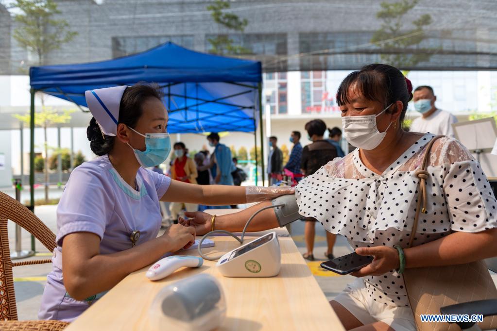 A woman measures blood pressure at a COVID-19 vaccination site of Jingcheng Hospital in Ruili City, southwest China's Yunnan Province, April 1, 2021. (Xinhua/Chen Xinbo)