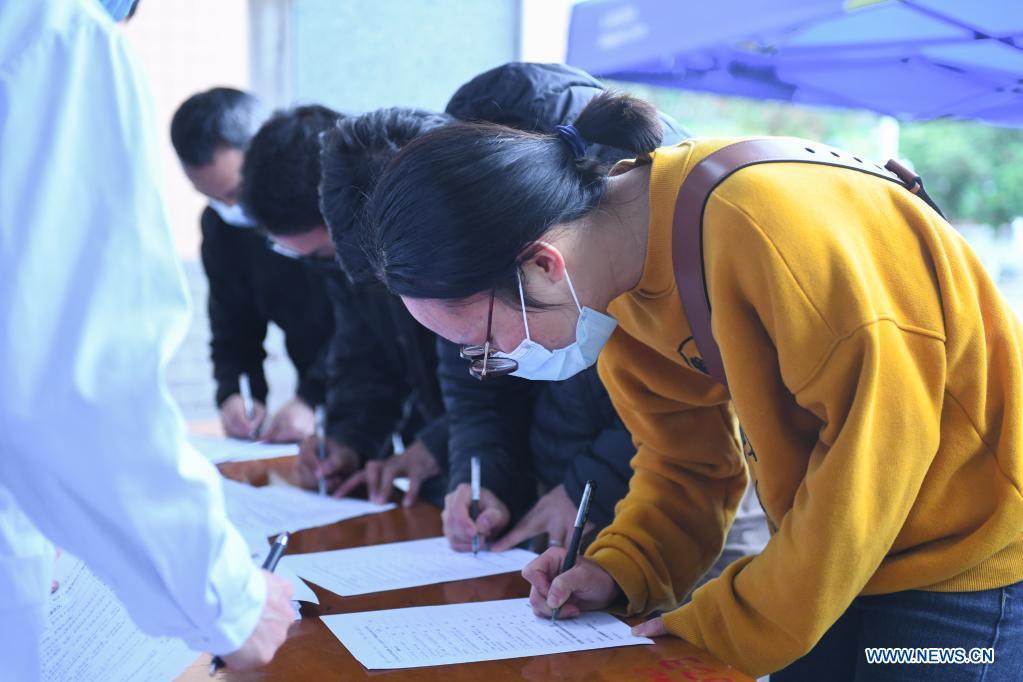 Teachers and students fill in the consent form at a temporary inoculation site in Hunan University of Science and Technology in Xiangtan, central China's Hunan Province, April 1, 2021. Recently, Xiangtan Central Hospital has set up a temporary inoculation site for COVID-19 vaccination at Hunan University of Science and Technology. The inoculation site is divided into two areas with 20 inoculation tables, which can vaccinate 20 people at the same time. The hospital plans to vaccinate more than 40,000 teachers and students. (Xinhua/Chen Zeguo)