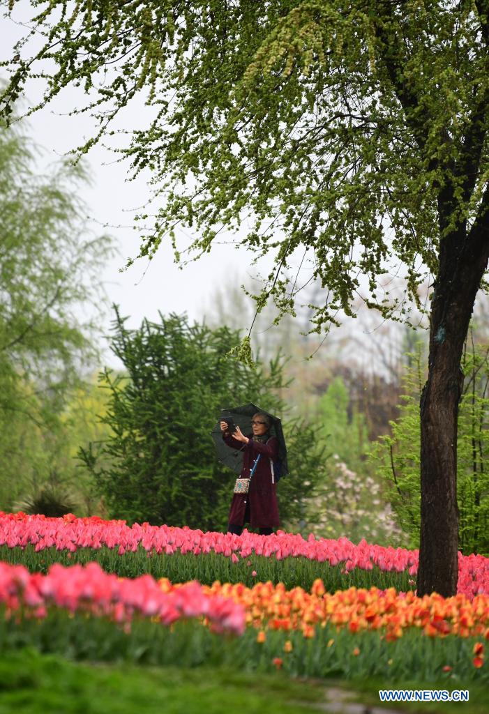 A tourist enjoys flowers at Xi'an Botanical Garden in Xi'an, northwest China's Shaanxi Province, April 1, 2021. The 29th spring flower show kicked off recently at Xi'an Botanical Garden. There are more than 30 kinds of tulips planted in the flower show with a total of 200,000 tulips planted in 3,000 square meters. (Xinhua/Li Yibo)