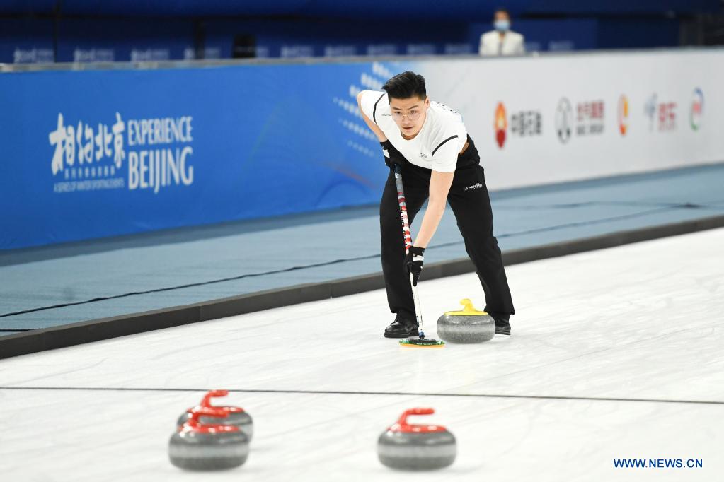 An athlete competes during a curling test program at National Aquatics Center in Beijing, April 1, 2021. A 10-day ice sports test program for the 2022 Olympic and Paralympic Winter Games is held between April 1 and 10, 2021. This test program is to give a test to competition organization, venue operation, and services and safeguarding. It will engage all ice sports of Beijing 2022, namely short track speed skating, speed skating, figure skating, ice hockey, curling, para ice hockey and wheelchair curling. (Xinhua/Ju Huanzong)
