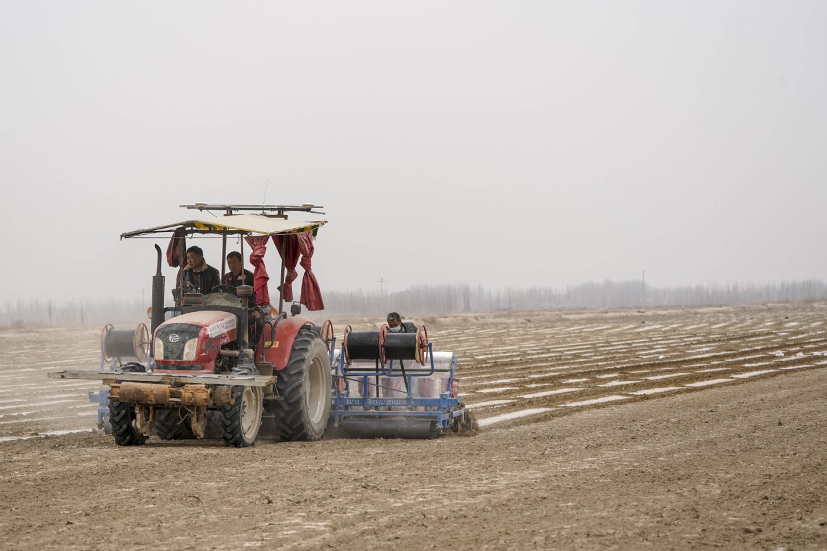 In Shaya county of Aksu prefecture, many tractors can be seen busily planting cotton fields, instead of lots of farmers sowing by hand, as spring temperatures rise.